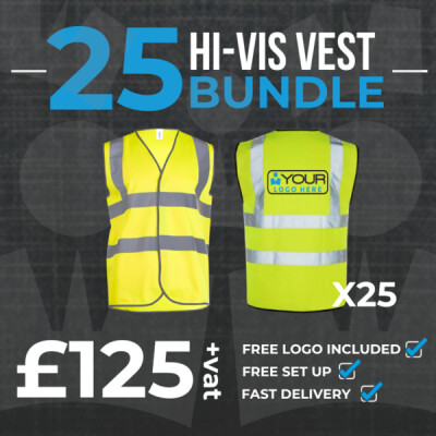 Grab this unbeatable bundle of hi-visibility vests today and ensure your whole team is safe and seen during work, just £125+VAT with a free L/C and back print, plus free delivery!